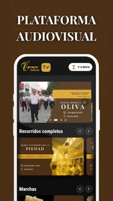 Et sentralt høydepunkt i El Carmen-appen er El Carmen TV, vår helt egen audiovisuelle plattform. Her kan du gjenoppleve gripende prosesjoner og storslåtte konserter, alt presentert med produksjoner av ypperste kvalitet. El Carmen TV tilbyr en dyp og tilgjengelig opplevelse, som lar deg fordype deg fullstendig i El Carmens unike lyd- og bildeunivers. Med et stadig voksende arkiv og lynrask publisering av nye forestillinger, setter El Carmen de Salteras en ny standard for deling av musikalske mesterverk.