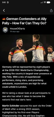 JustDarts transformerer din måte å følge dart på. Vår dynamiske nyhetsstrøm holder deg oppdatert med de ferskeste overskriftene, eksklusive analyser og dybdeartikler – alt skreddersydd dine interesser. Fra det siste resultatet i World Darts Championship til detaljerte rapporter om Michael van Gerwen og Luke Littler, er du alltid ett pilkast foran. I tillegg sørger JustDarts sin unike Story Feed for lynraske oppdateringer og korte nyhetssammendrag, slik at du øyeblikkelig får med deg de viktigste hendelsene.