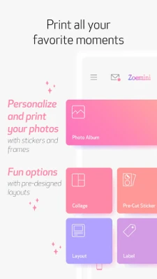 Uttrykk deg fritt med et rikt utvalg av kreative verktøy rett ved fingertuppene. Gi bildene dine et personlig preg ved å legge til morsomme klistremerker, perfekt for å markere en følelse eller feire et spesielt øyeblikk. Forvandle stemningen i ethvert fotografi med et variert bibliotek av filtre og rammer, som tar bildene dine fra hverdagslige til ekstraordinære scener. Ønsker du å legge til en personlig melding eller en kunstnerisk touch? Med verktøy for tekst og tegning kan du skrive, skrible og tegne direkte på bildene dine før utskrift, og dermed formidle akkurat det du ønsker.