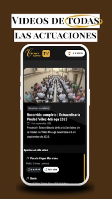 Et sentralt høydepunkt i El Carmen-appen er El Carmen TV, vår helt egen audiovisuelle plattform. Her kan du gjenoppleve gripende prosesjoner og storslåtte konserter, alt presentert med produksjoner av ypperste kvalitet. El Carmen TV tilbyr en dyp og tilgjengelig opplevelse, som lar deg fordype deg fullstendig i El Carmens unike lyd- og bildeunivers. Med et stadig voksende arkiv og lynrask publisering av nye forestillinger, setter El Carmen de Salteras en ny standard for deling av musikalske mesterverk.