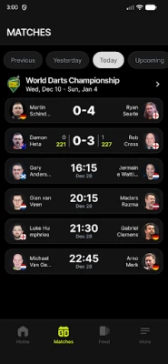 Gå aldri glipp av et eneste pilkast med JustDarts sitt omfattende Matchsenter. Her finner du sanntidsresultater, live statistikk og detaljerte kampoversikter for absolutt alle PDC-turneringer, inkludert de spennende øyeblikkene fra PDC World Championship på Ally Pally. Følg favorittspillerne dine tett, hold oversikt over tabeller og tidsplaner, og gjenopplev høydepunktene når det passer deg. JustDarts er utviklet for den dedikerte dartentusiasten, og er ditt uunnværlige verktøy for å være i hjertet av sporten.